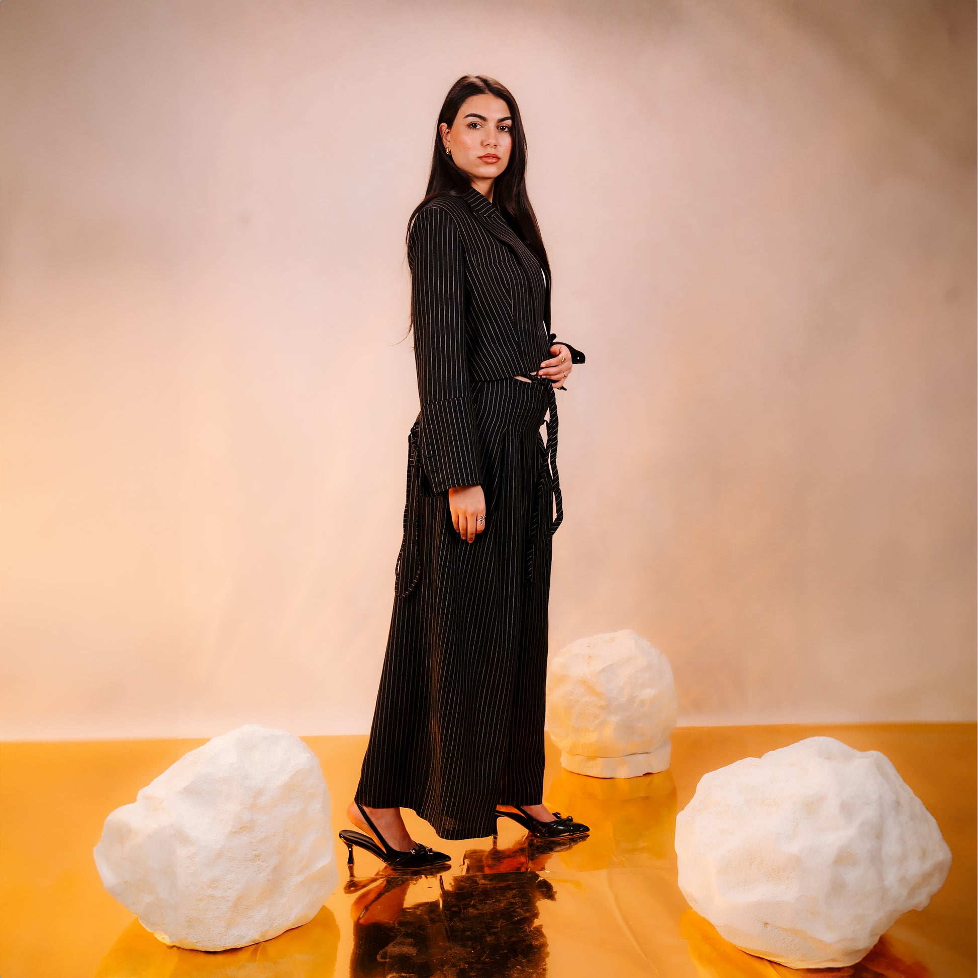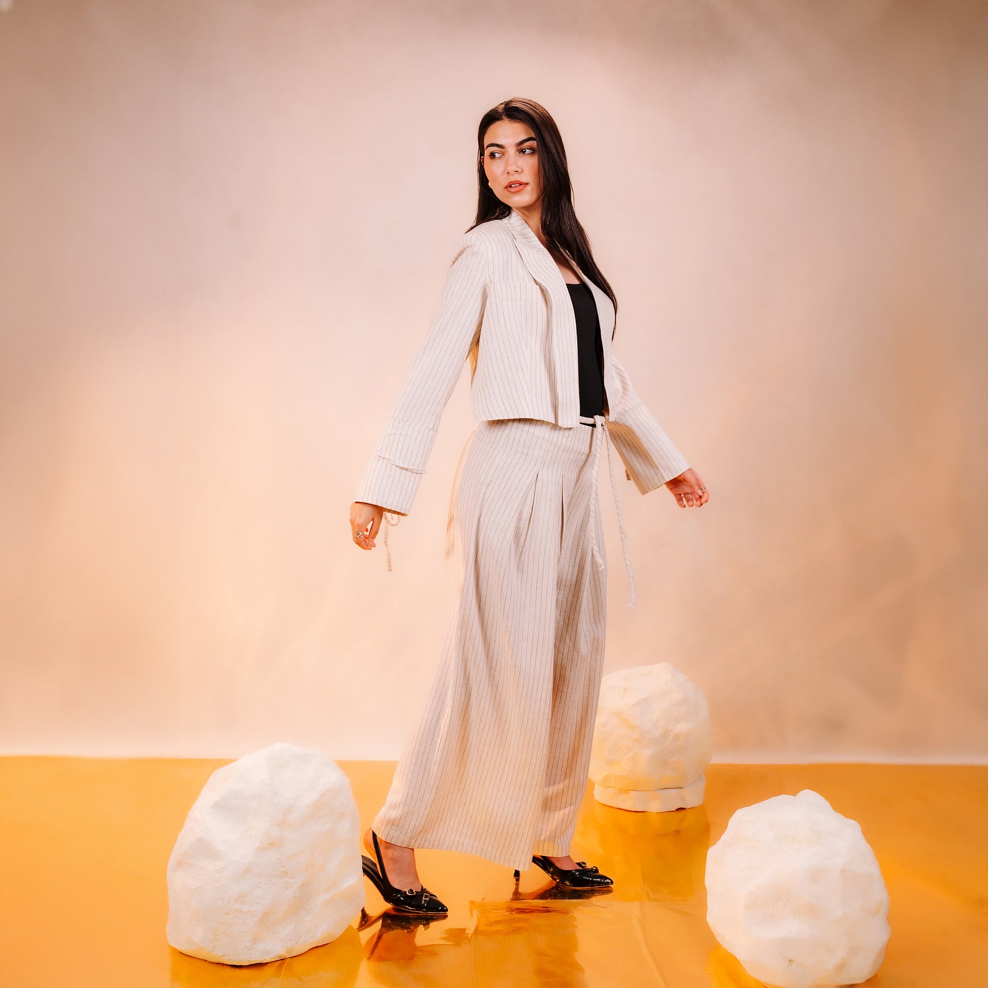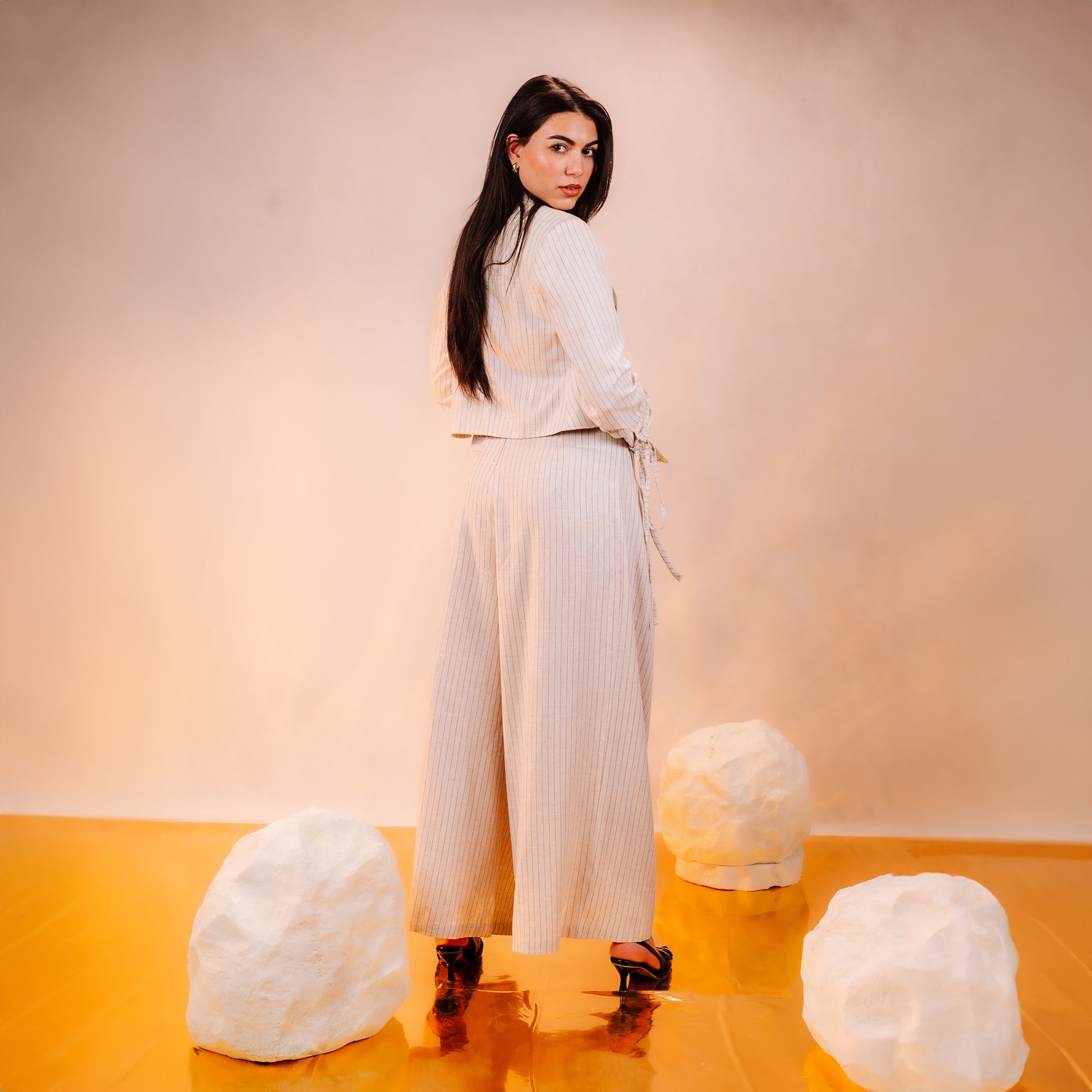 These trousers are a masterclass in soft tailoring and architectural movement. The silhouette features a sophisticated high-rise waist that leads into a dramatic, wide-leg cut, designed to elongate the frame with effortless grace. A defining artisan detail is the integrated knotted drawstring, which offers a touch of organic texture to the clean waistband. Rendered in a refined sandstone hue, the garment is elevated by delicate, vertical pinstripes that provide both visual length and a high-end, classic aesthetic.