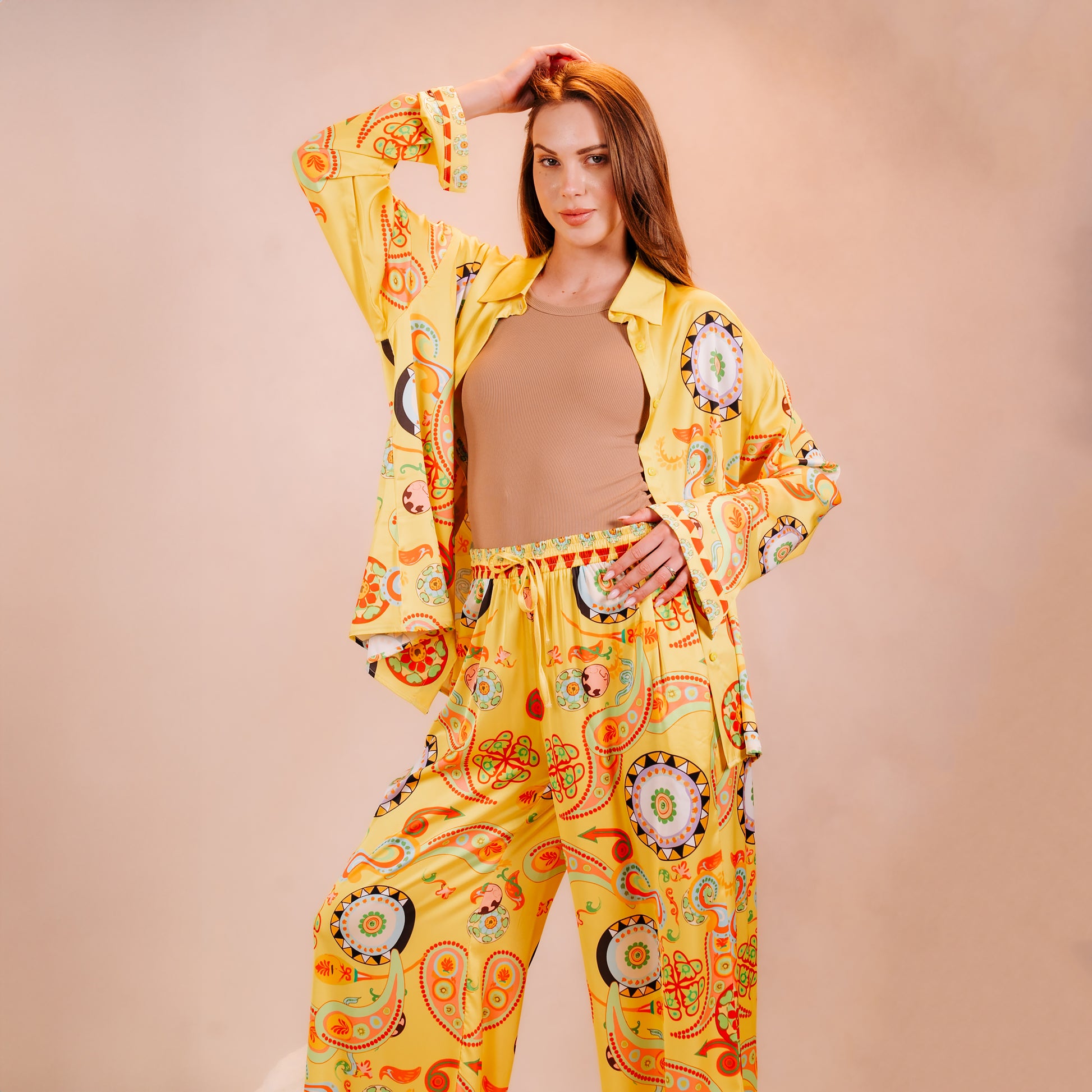 This two-piece ensemble is a masterclass in vibrant fluidity and maximalist charm. The shirt features an effortless, oversized cut with a sharp spread collar and dramatic, long sleeves finished with uniquely patterned cuffs. It flows into stately wide-leg trousers that are anchored by a comfortable, high-rise elasticated waistband with a delicate drawstring detail. Rendered in a brilliant saffron yellow satin, the set is adorned with an intricate bohemian-inspired print, blending paisley swirls with geometric medallions in a rich palette of terracotta, forest green, and azure blue.