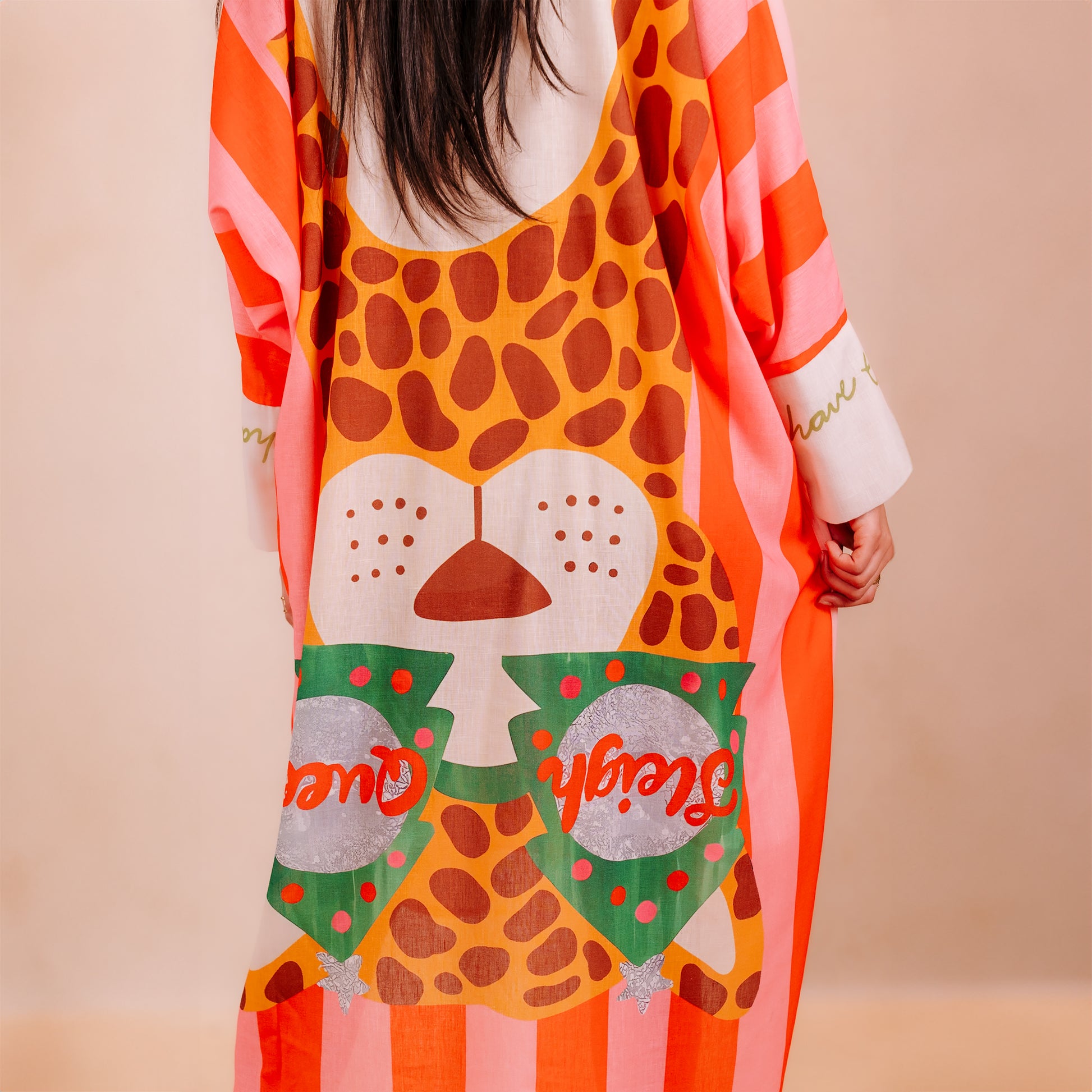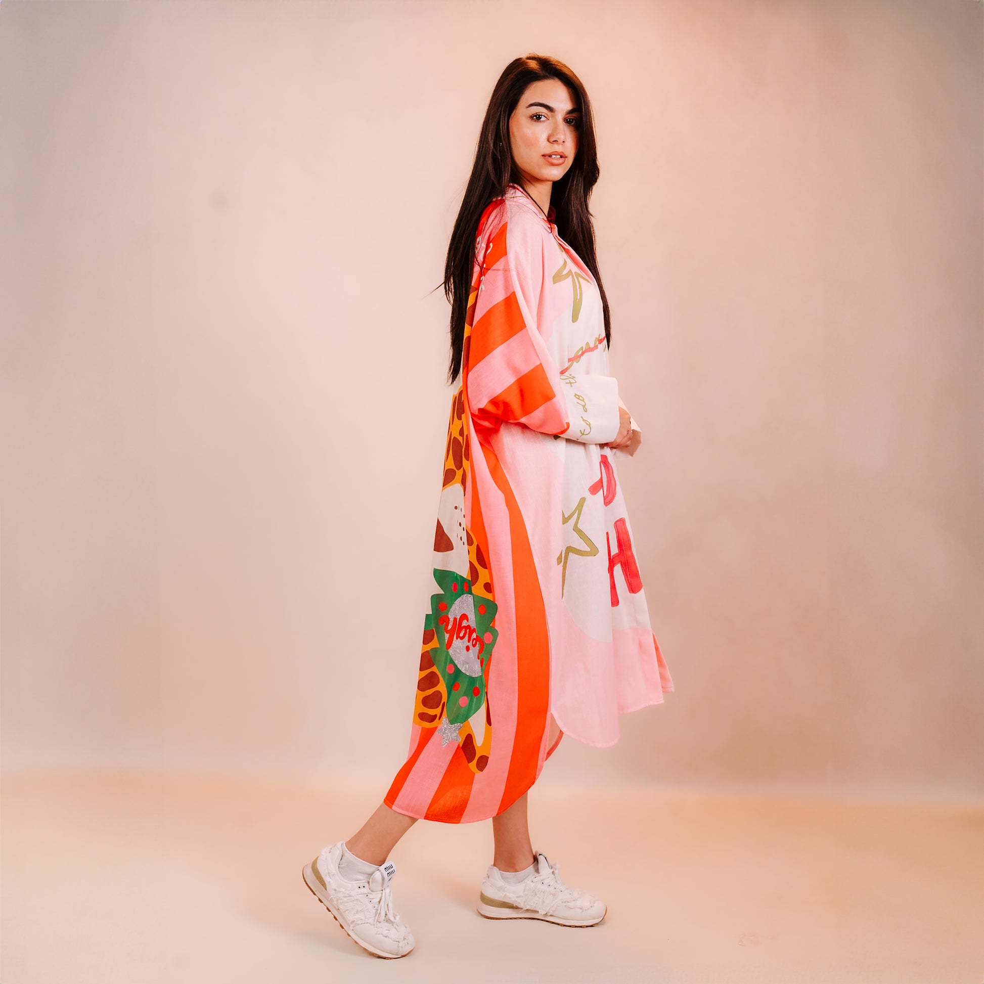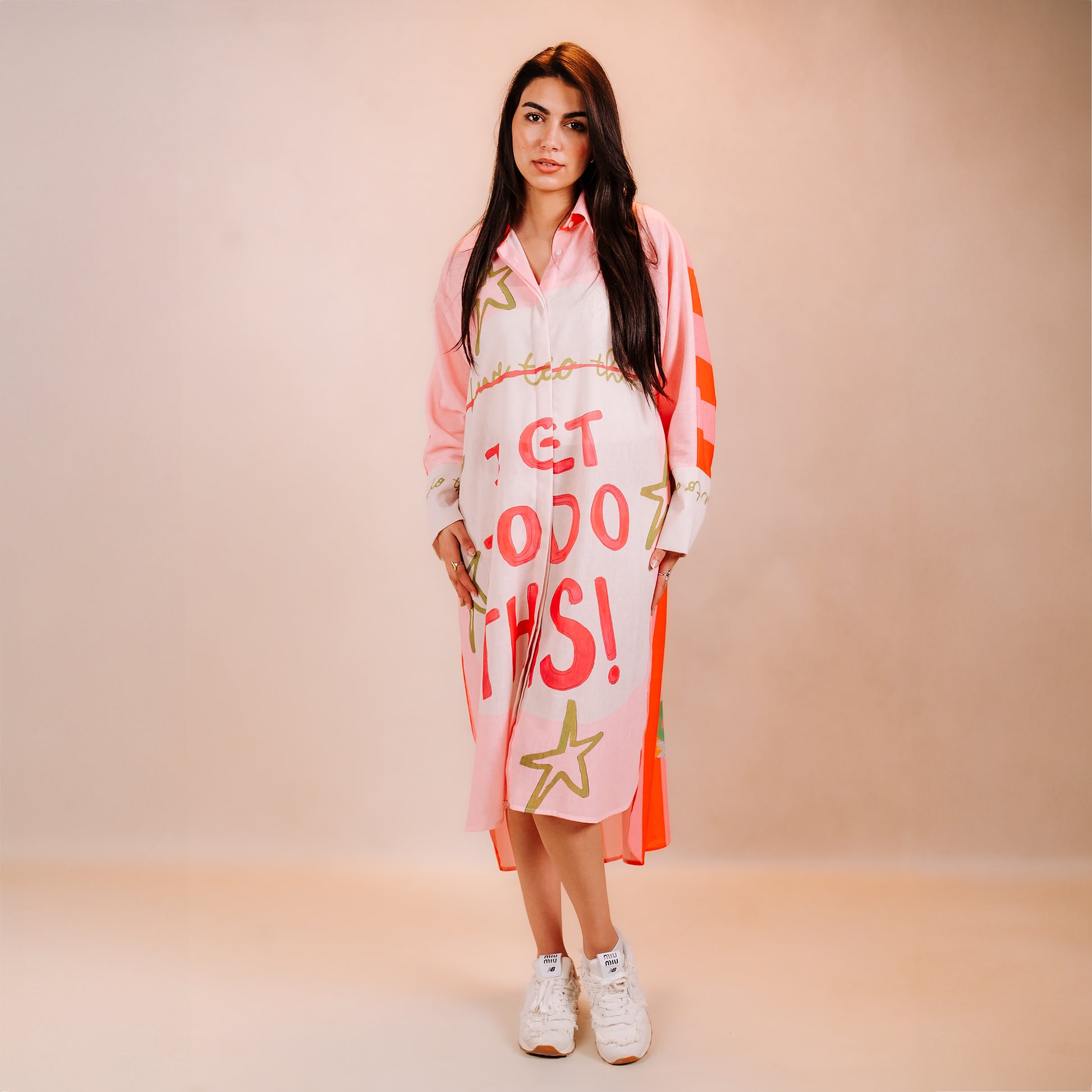 This midi-length shirt dress is a masterclass in contemporary maximalism. Crafted with a relaxed, oversized silhouette, it features a striking high-low hemline that adds dynamic movement to every step. The classic button-down collar and structured long sleeves provide a tailored counterpoint to the whimsical, hand-painted aesthetic of the graphic prints. Bold typography—"I GET OOO THIS!"—is juxtaposed with playful star motifs and abstract patterns in a palette of soft blush pink, fiery orange, and sage green.